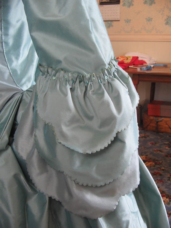 This was my first attempt at a robe a la Francaise, or saque. The dress is hand sewn from silk tafetta, with the exception of the petticoat side seams. The robings and skirt are trimmed with pleated and puffed self-fabric, in a waving pattern that is frequently seen in this era. I also accented this trim with matching blue-green sequins. The sleeve ruffles and petticoat ruffles are scalloped and also accentuated with sequins.