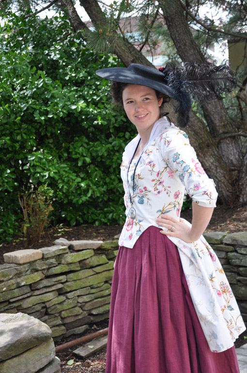 A circa 1780 printed cotton caraco jacket, worn with a berry colored linen petticoat.