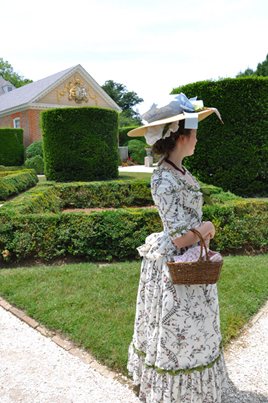 I'm really pleased with the outfit as a whole. The fluffy petticoat and jacket skirts are so bouncy and fun. And I'm really pleased I added the green ribbon. It gives the perfect pop of color and breaks up the print. There is some wrinkling on the bodice front. When I noticed this it was extremely frustrating because I spent so much time perfecting the fit of the muslin, but then I remembered that I didn't have enough linen to cut the lining fully on the bias. I think its fighting with the printed cotton and not stretching as much as it should. At first I thought I would rip on the lining and add a new piece, but that would require me to redo all the trimming. Perhaps I will revisit that idea before I wear it again.