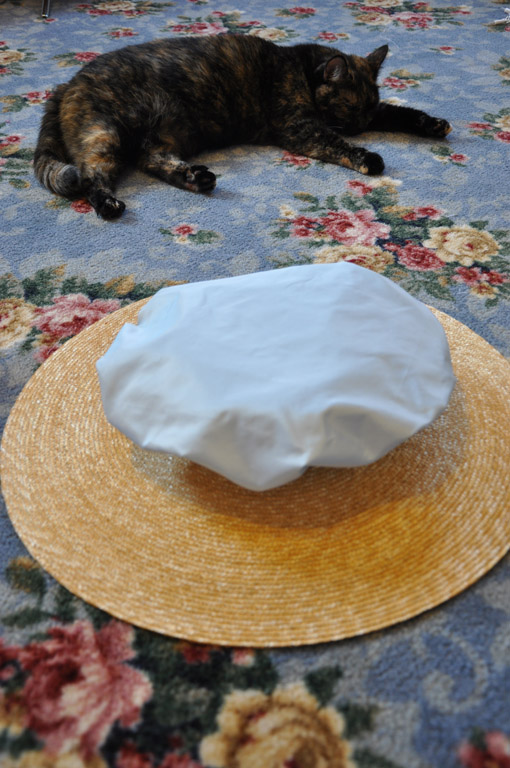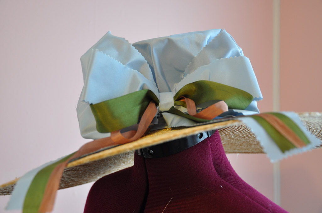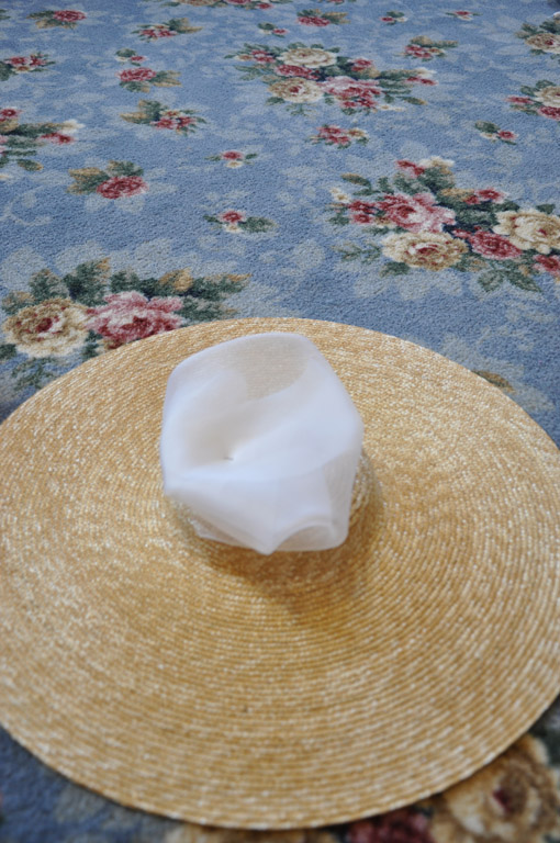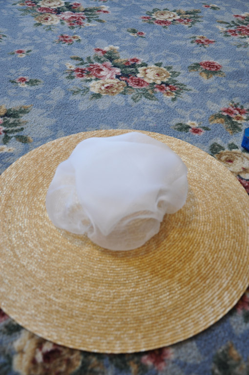 For the taffeta layer I cut out a circle using the hat as a template. I would have liked to have made it bigger, but I was working with a limited amount of fabric (less than half a yard) and I really wanted to use the blue silk. I gathered the edge of the taffeta and pinned it over the organza, pulling it out further over the brim of the hat.