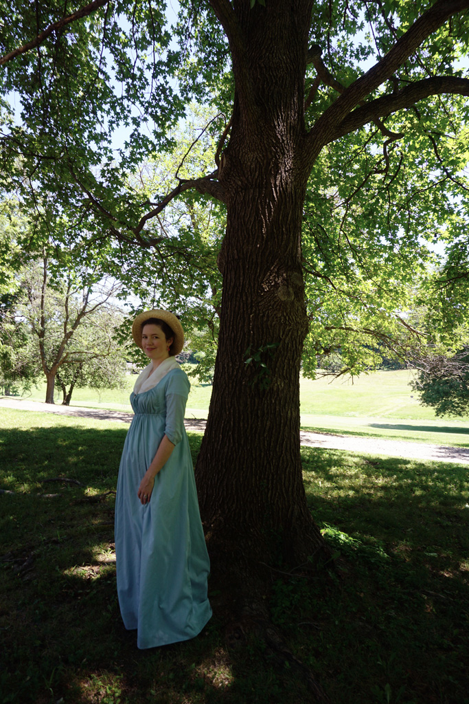 My obsession with the 1790s and transitional drawstring dresses continues! It’s my go-to style when I need something comfortable, quick to make, and easy to wear, so of course it’s what I made this summer for the Louisville Jane Austen Festival. I shared photos of the finished dress in my early post on the 2017 Jane Austen Festival, but I wanted to talk more about the actual construction process.