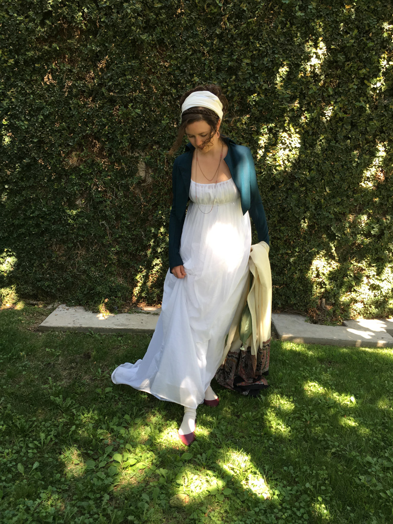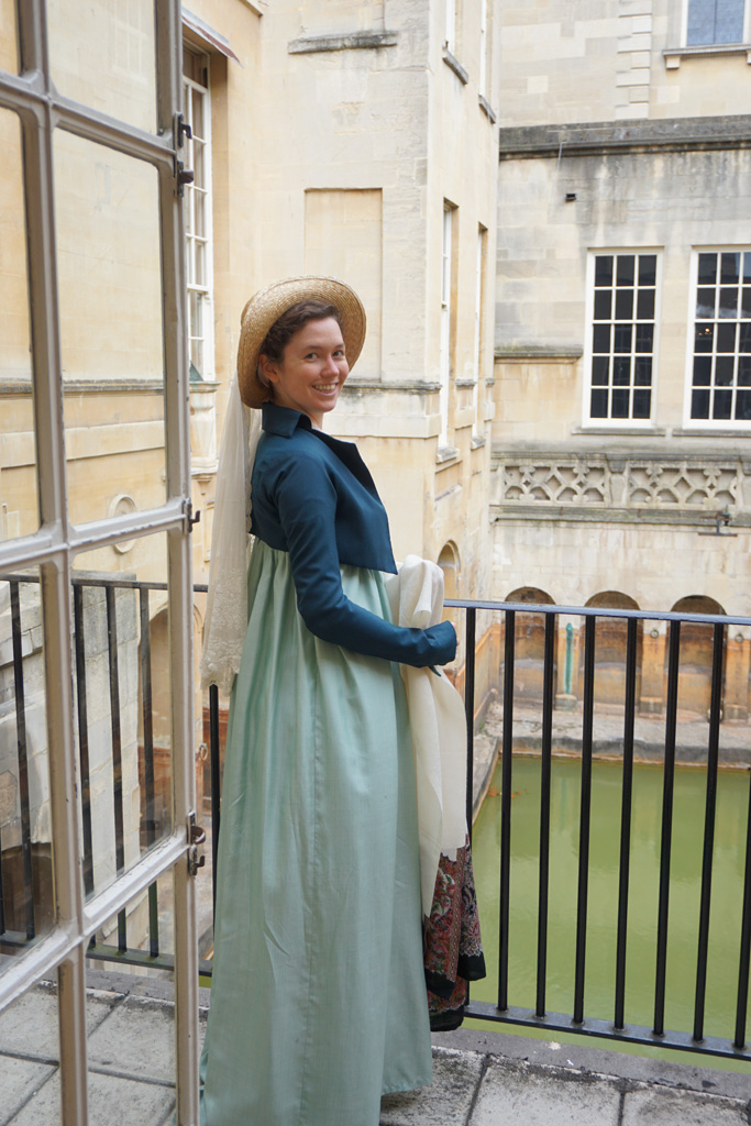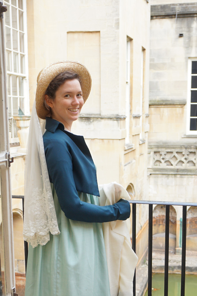When I was planning what to make for my trip to Bath, an all-weather spencer topped the list. The only spencer I had was my blue spotted silk, which as lovely as it is, isn’t good to wear in the heat or in the rain. Yes, I realize my trip was in June, but I run cold and England’s idea of summer is not mine. I froze on both my previous trips and was determined not to do so again!