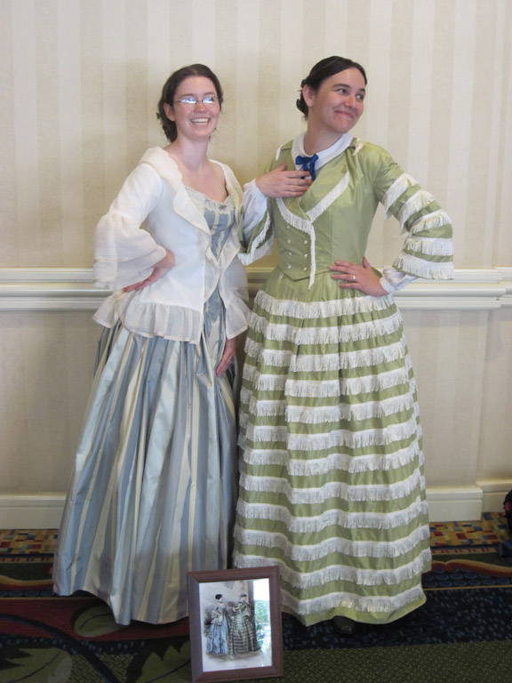 I fell in love with the blue striped dress on the left of the above fashion plate and immediately knew I had to make it. Luckly, my dear friend Sara decided she had to have the green dress on the right and hillarity ensued. We wore our dresses together at Costume College 2010 and posed with a framed copy of the fashion plate.