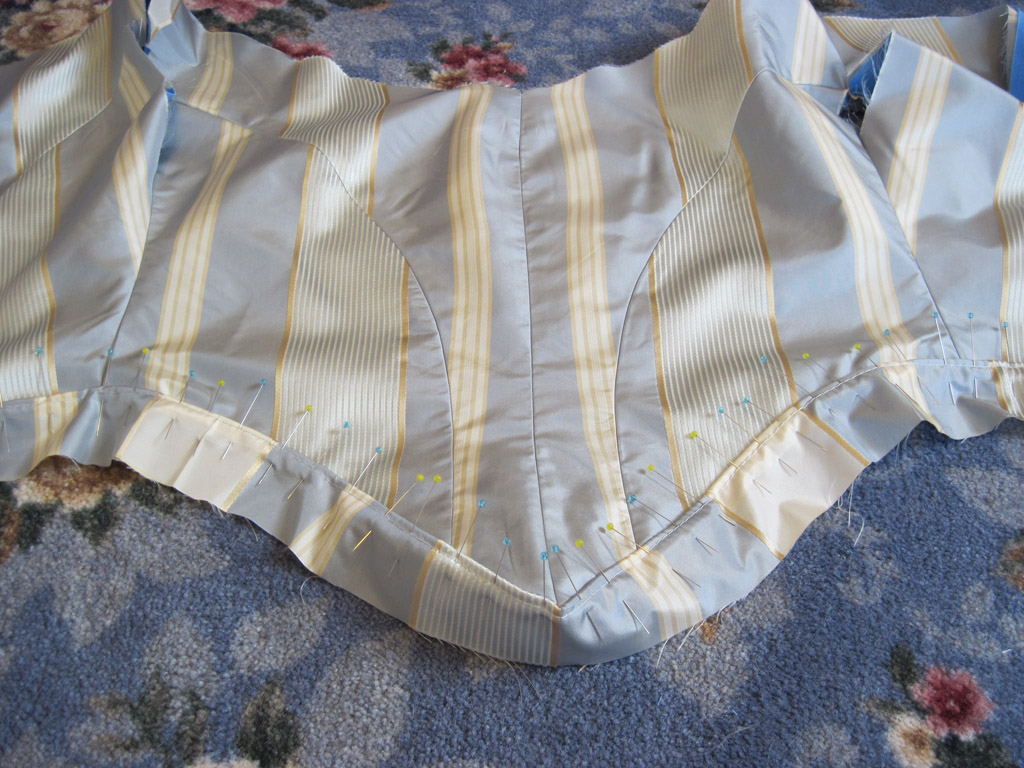 I decided to make the skirt and bodice separate so I could easily refit it later or make a day version with the left over silk. The front 2/3s of the skirt is pleated with knife pleats and the very back is cartridge pleated. The skirt was then stitched to a waistband and basted to the bodice.
