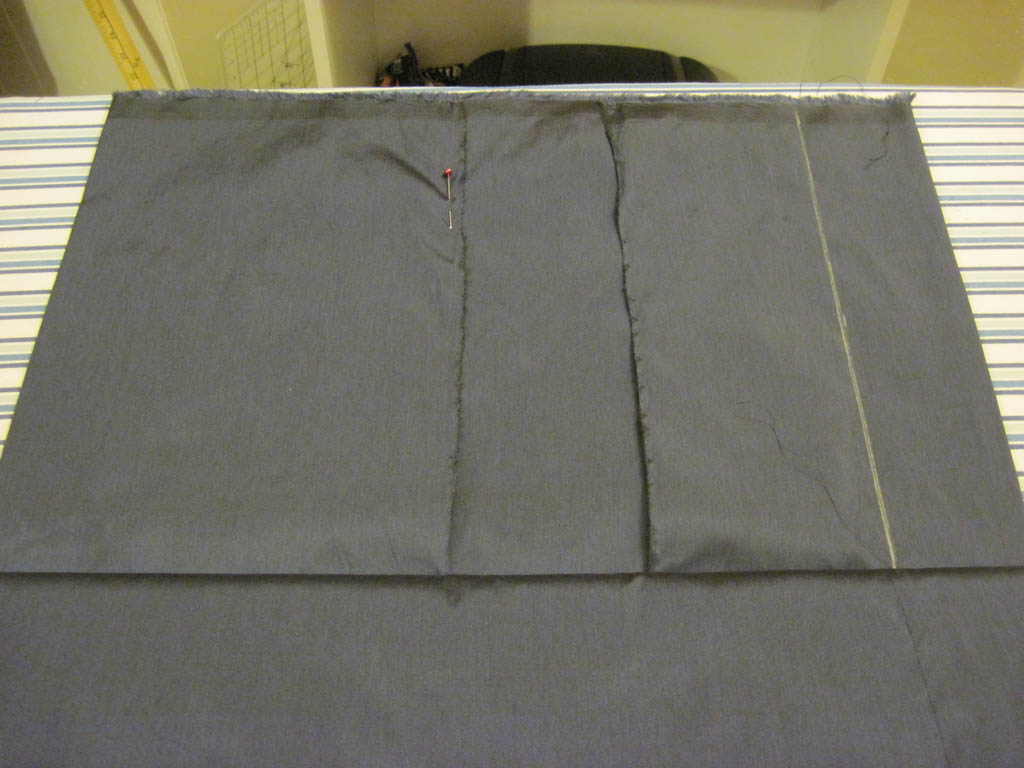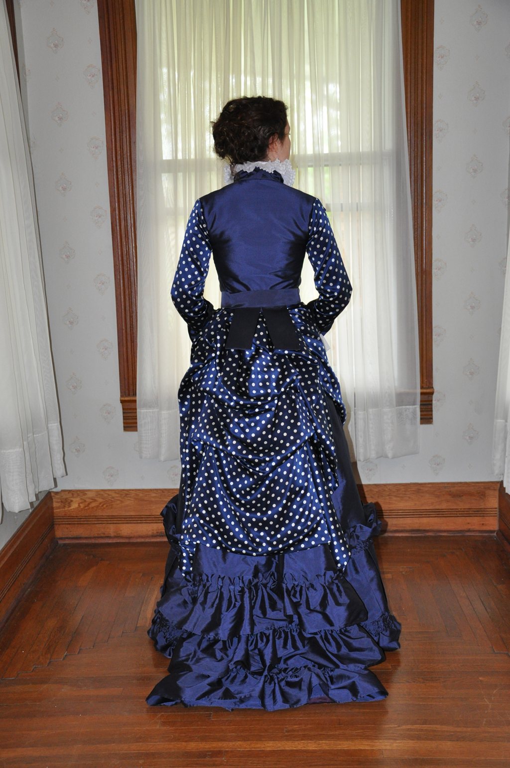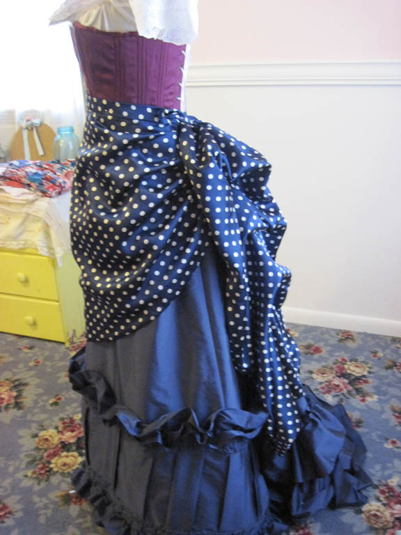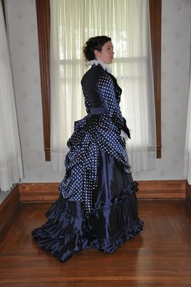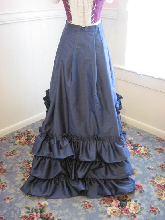 The over skirt is based on the 1870-1 overskirt on page 28-29 of Patterns of Fashion 2. I flat lined the silk charmeuse with the same cotton sateen as the underskirt. The front portion is simply hemmed, while the back section is faced with a 12 inch strip to avoid showing the lining when the skirt is polonaised. The front is a crescent shape with pleats on the side, like the original. The back is one width of fabric and the shaping is achieved using tapes that have been tacked to the fabric.
