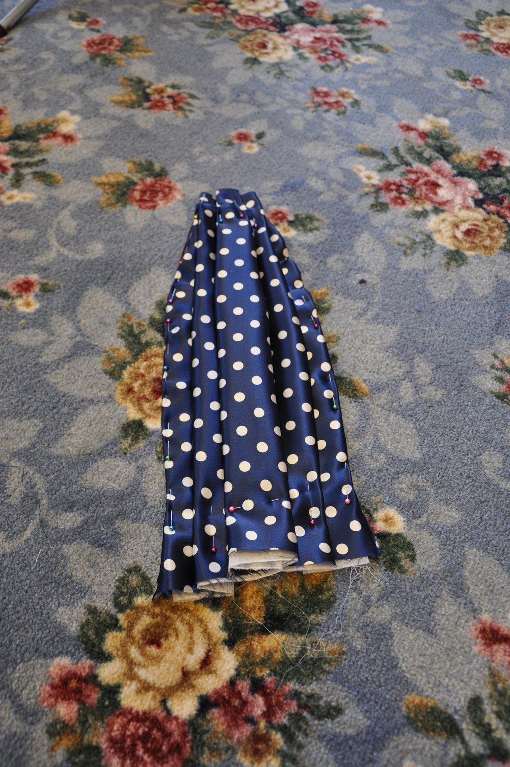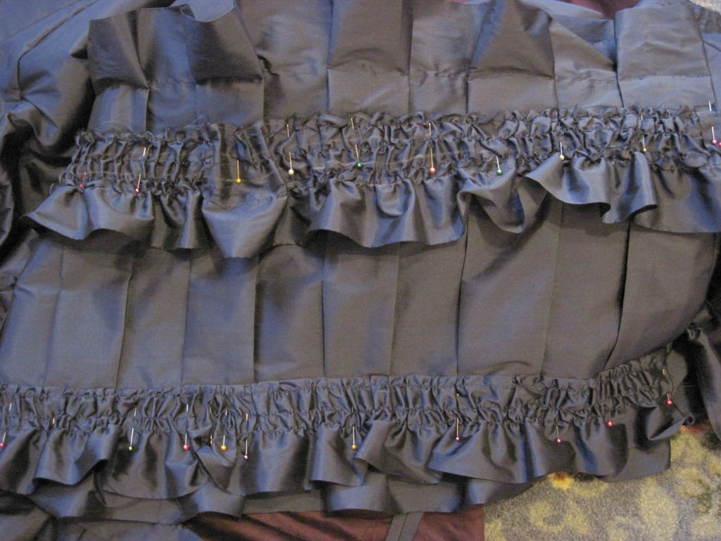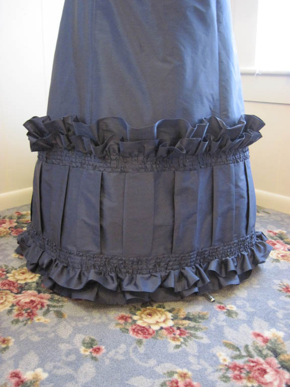 The ruffle decoration on the underskirt is comprised of three parts. First, on the front of the skirt there is a knee high box pleated ruffle. I cut a strip of taffeta twice the width I needed and then folded the cut edges into the middle, doubling the fabric and creating a finished edge. This strip was box pleated to the skirt and basted down by hand. To create the second ruffle, I gathered two more narrow strips of doubled taffeta and attached on top of the first ruffle. The gathering rows were then topstitched by machine. The back ruffles were cut on the straight of the grain and the two lower ones were simply gathered and stitched on by machine. The top ruffle was box pleated and sewn on by hand.