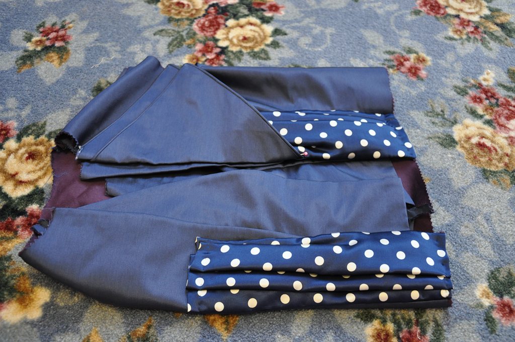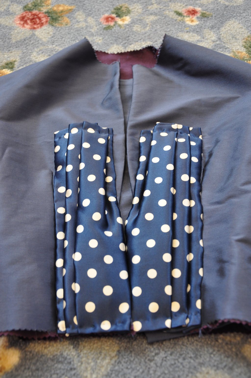 For the lapels and spotted pleats, I attached pieces of pleated charmeuse interlined with cotton organdy to the over bodice, angling them so they were flush with the bottom edge of the bodice but did not show under the top of the lapels. The lapels were then sandwiched between the bodice and the spotted pleats, making it appear that they came through the spotted part of the dress.