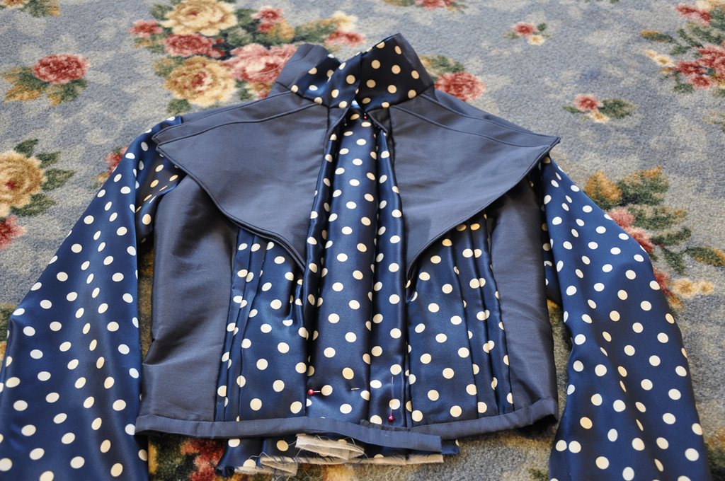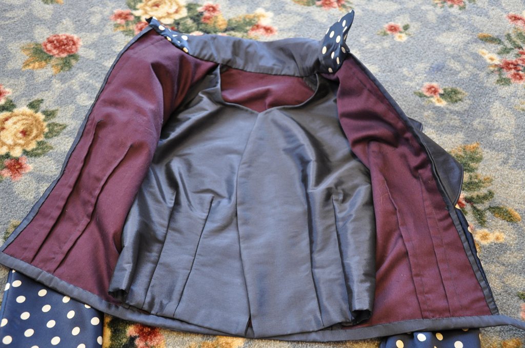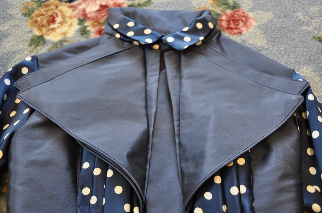 The collar is one layer of taffeta with ends of the spotted charmeuse, interlined with cotton organdy and the faced with another layer of the taffeta/charmeuse combination. The collar is sewn to the outer bodice and I used the lining to cover the seam allowance.