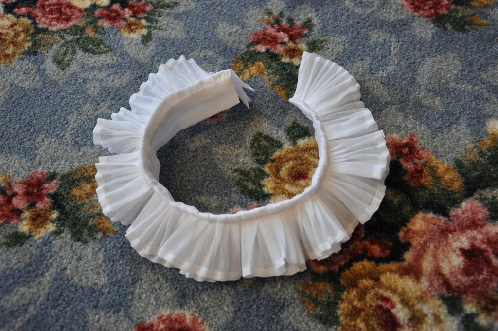 For the organdy ruff, Katherine pleated the fabric using the antique fluter and mailed it to me so I could construct my ruff. I pleated the fabric in two layers to a shaped band and sandwiched that to another band to finish seam allowance. The pleats were then folded over and basted to encourage them to stick out rather than up.