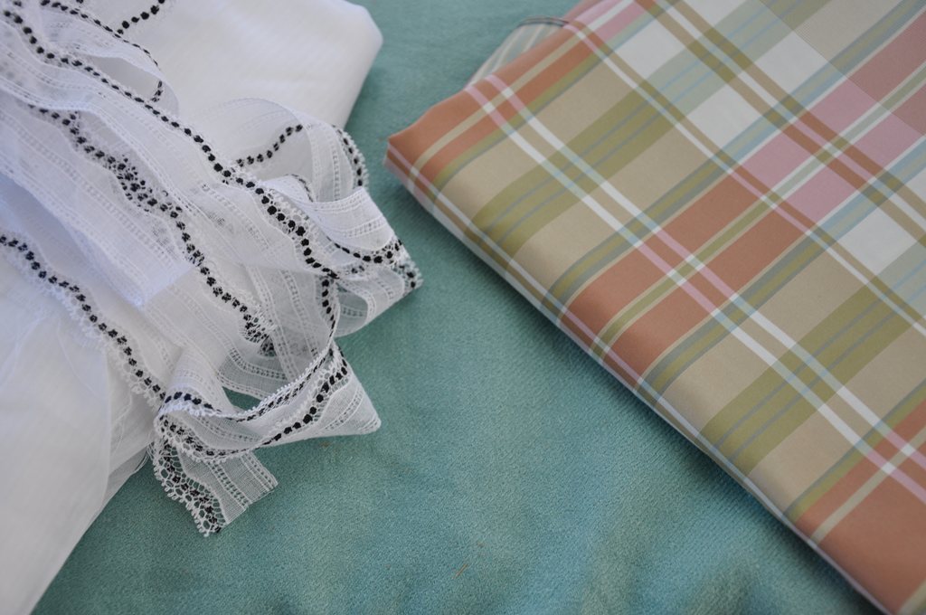 Striped cotton voile for the blouse, green wool/linen blend for the skirt, and plaid silk taffeta for the accents.