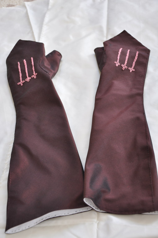 Costume Close-Up and then fit the muslin on my arm. It actually came together much more easlily than I had anticipated. The original mitts are lined in leather, but I'm not a fan of working with leather or having it touch my skin, so I went with a light-weight linen for the lining and a brown/black changeable silk taffeta for the outer fabric.
