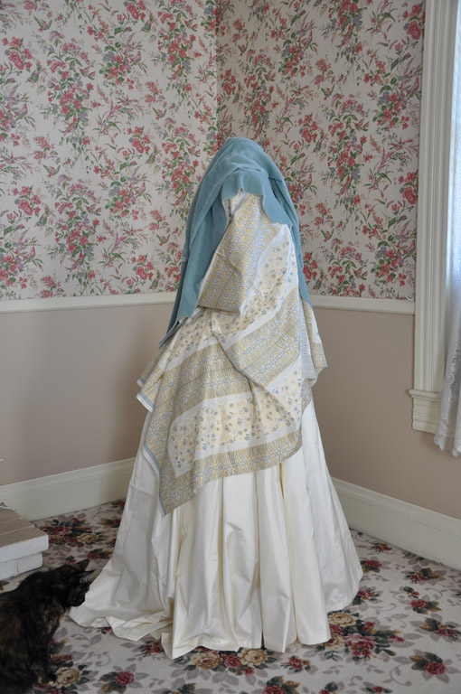 To justify buying the cream silk for the underskirt and trimmings, I decided I want this skirt to do double duty. I had a cream and blue floral striped silk in the stash and coordinating blue velvet that will be perfect for another early bustle dress! I haven’t decided the exact style yet, but I’m thinking either a polonaise or maybe a Watteau backed over gown. I plan to wear the Victorian naturalist outfit to Costume College next year, so it only makes sense to wear the cream spotty outfit and the blue floral stripe too. Same undies and same underskirt means less luggage I have to haul across the country!