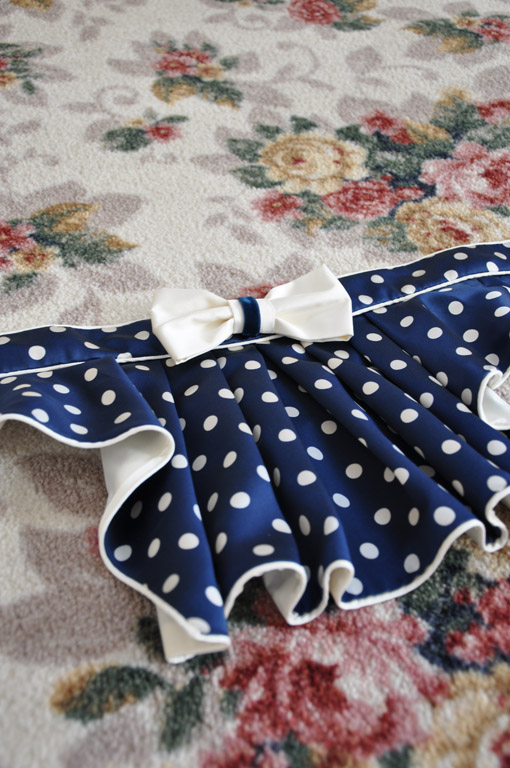 The neckline and sleeves are trimmed with gathered strips of cream silk, layered with vintage cotton lace and navy velvet ribbon. Silk bows with velvet ribbon finish off the neckline, peplum and sleeves. The outer sleeve seam was sewn to just above the wrist, the raw edges were then finished with a narrow hem and the decoration applied.