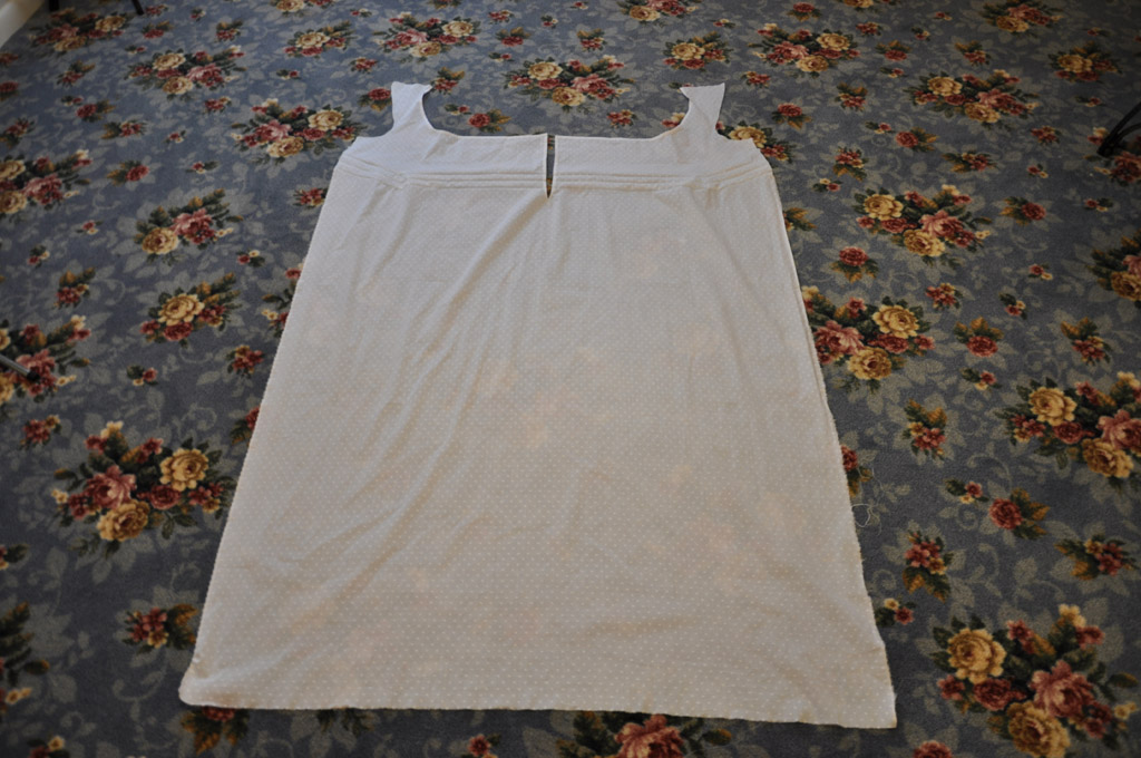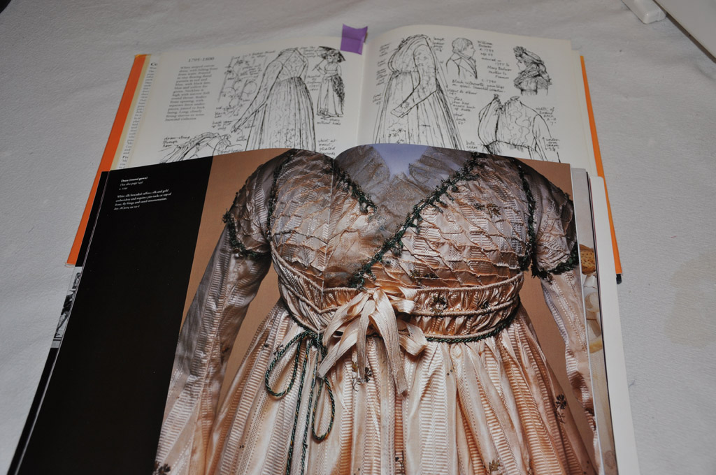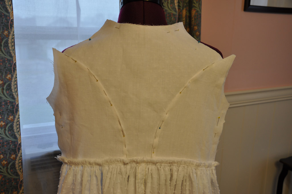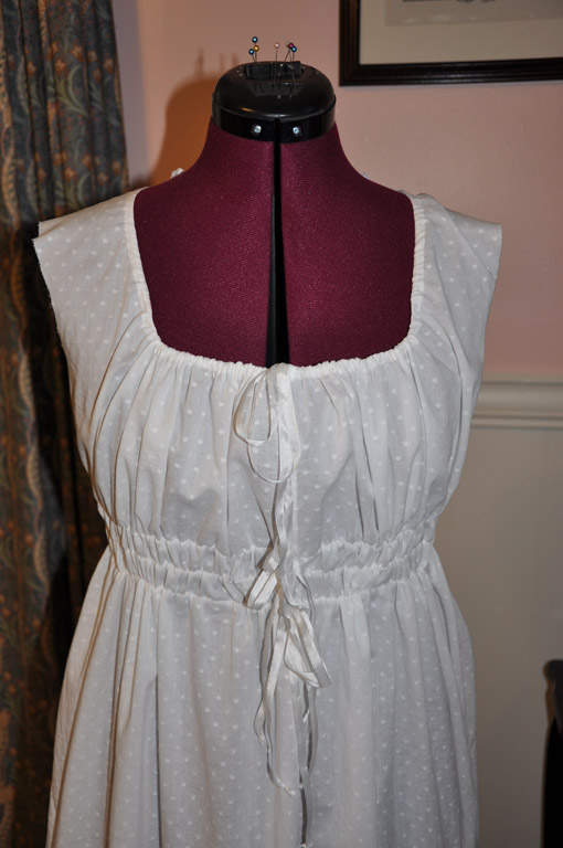 I used my basic gathered front regency pattern as a base, but decided to go for a slightly earlier style by lengthening the back pieces and lowering the front drawstring channel. The waist hits just above my natural waistline like the dress pictured in