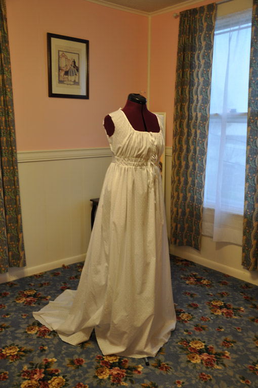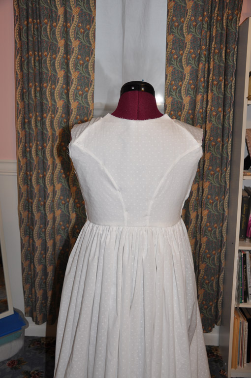 How many polka dot dresses does one girl need? Well, if you are me, about a million! Before Christmas I started a new mid-1790s white gown. My old one is covered in brown stains, the casualty of a leak in my costume closet (but thankfully one of the few casualties), so it was time for a new one! This time I picked a spotted cotton from the stash that I had originally earmarked for a summer bustle gown. The fabric has raised dots but I choose to use the back side for a more subtle look.