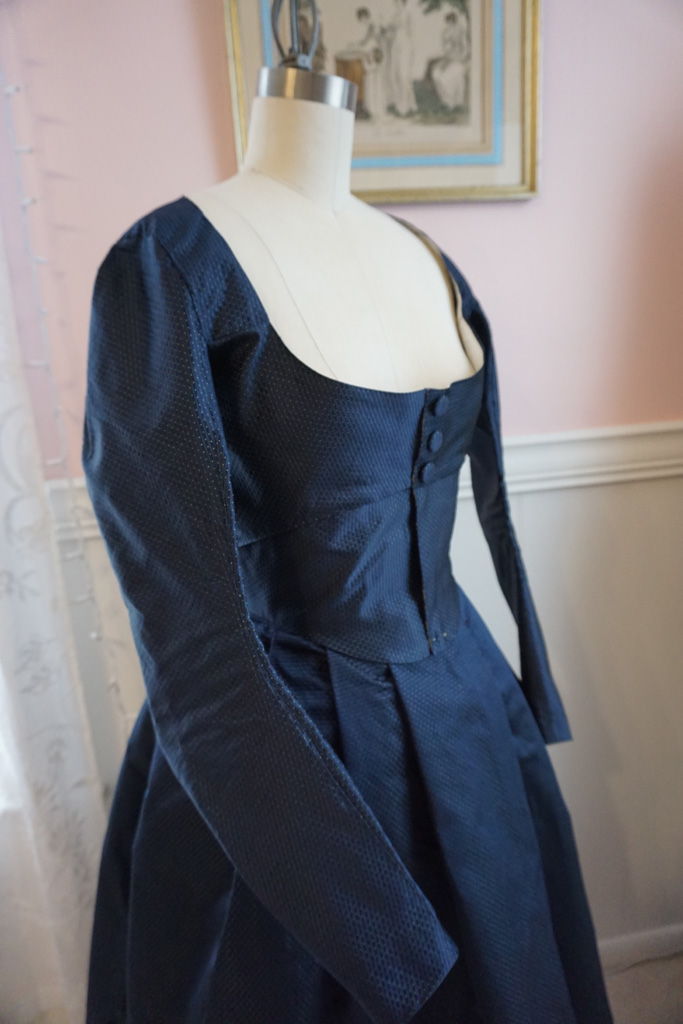 This time I decided to start my process completely from scratch. I browsed paintings, fashion plates, and extant garments until I had a solid idea of what I wanted – a jacket with short, fluffy skirt, cut-away front, long sleeves, and a matching petticoat. Then I focused on extant garments and pattern diagrams to help me alter my 18