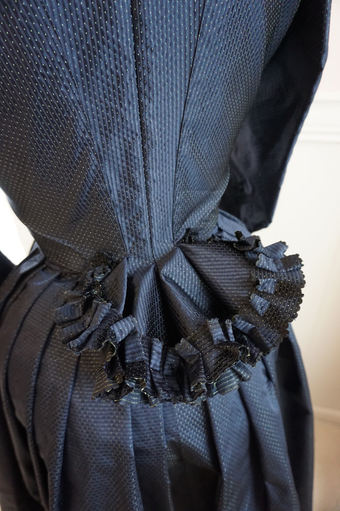 The skirt of the jacket was hemmed and then trimmed with scalloped pinked self-fabric strips, arranged in box pleats spaced about a half inch apart. I copied the trimming from the Les Arts Décoratifs jacket, but I also noticed similar trimming on other extant jackets, as well as in portraits.