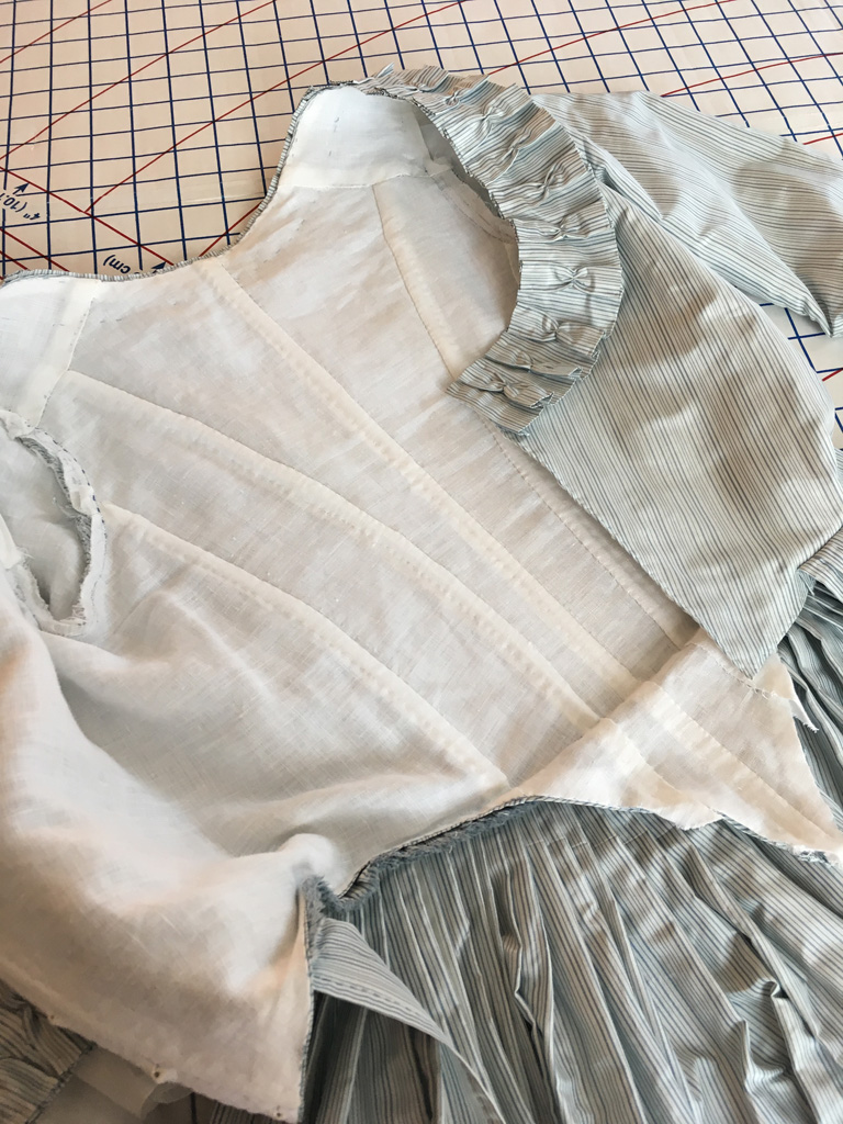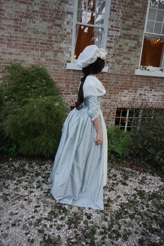 my mid-1780s blue stripe gown which no longer fit, and altered it to a 1790–4 shape.
