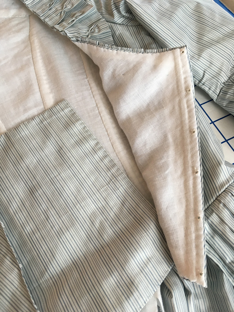 Once I had the bodice altered, I re-pleated the skirt panels and mounted them just above the finished edge of the bodice. The original back point was left intact and free on the inside of the skirt. When I was in England a couple of years ago, I was lucky enough to examine two dresses at the Fashion Museum in Bath that were altered in this same way. Unfortunately, I can’t share photos from the study session, but it’s one of the things that sparked my inspiration for this project. The little back flippy-flappy, as I like to call the old back bodice point, is one of my favorite details. I love how multiple seamstresses couldn’t be bothered to finish the edge, or as Carolyn of