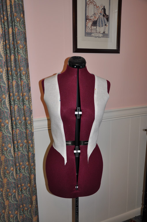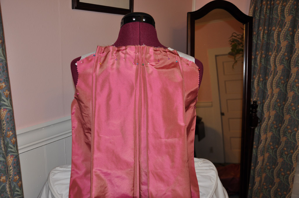 I started by creating a new fitted lining using my basic 18th century bodice as a base. The line lining has lacing and boing up the center back and I left a 2 in gap at the bottom for adjustability. The lining was assembled by machine and then I draped the back pleats directly onto the lining.