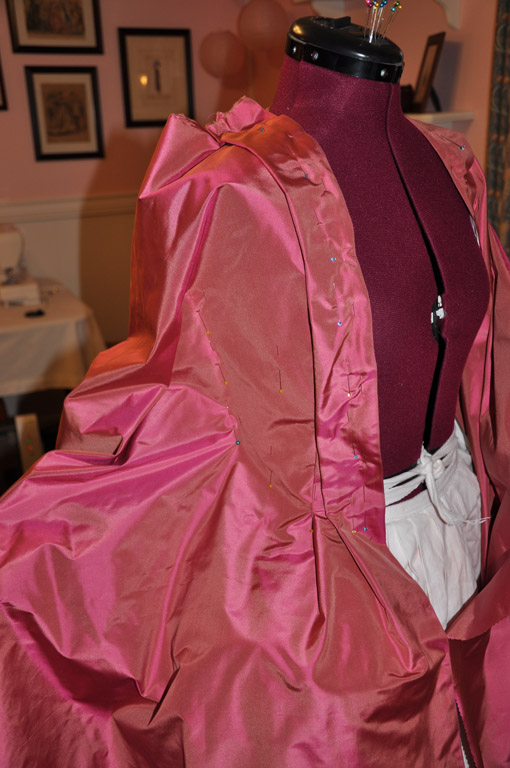 Each front piece is one half width of taffeta. I used the selvage for the robing and skirt edges and pleated the robings on to the lining at the shoulders first. The robings are a 2.5 inch knife pleat. After the shoulders, I continued the pleat down the front of the lining, leaving a ¼ inch over hang, which I turned under later. I then pinned a dart from bust to waist, hiding it under the robing. The excess fabric was smoothed to the side seam and the arm holes and shoulder seams were trimmed to match the lining. I tried on the dress to check the fit of the dart and adjusted the side seam as necessary. The excess fabric was trimmed from the side seam to one inch above the waist, like the back pieces, and the full width of fabric was left for the side skirt.