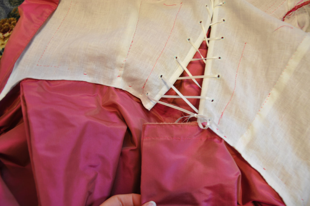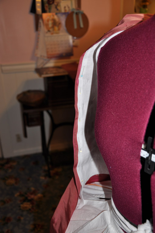 Continuing with the rose francaise construction notes, here is how I draped the front and attached the skirts.