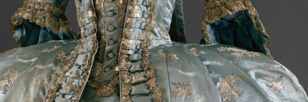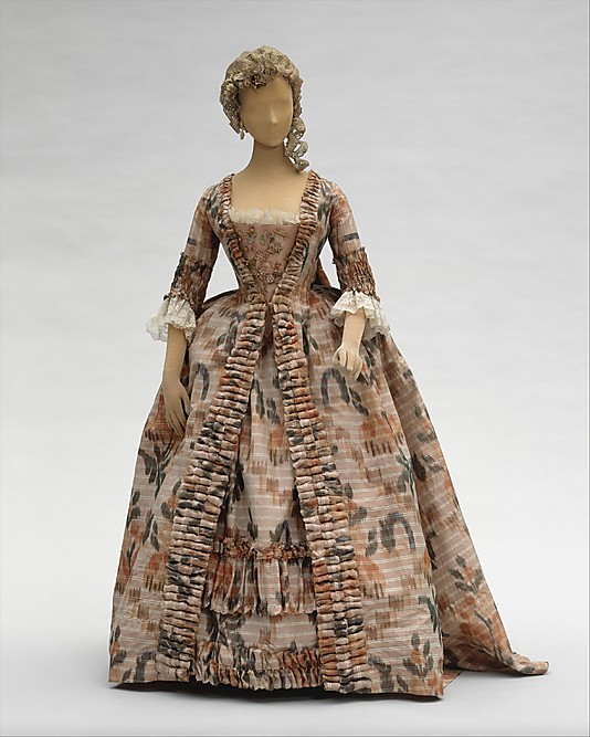 The Cut of Women’s Clothes. Instead of a separate waist seam it has a vertical dart that runs from bust to waist, easing the bodice fabric into the skirt. However, the diagram is dated 1740-50, much earlier than my target of 1760-65. By the 1760s most dresses were being cut with a separate waist seam at the front. I did this with my aqua Française and while I like the look, I really wanted to try a new type of construction. I’m more attracted to the later trimming style though. A search through my costume library confirmed the idea that most of the 1760s were cut with a waist seam, however, I found two dresses from the MET that have the vertical dart and they are dated much late. That’s good enough for me!
