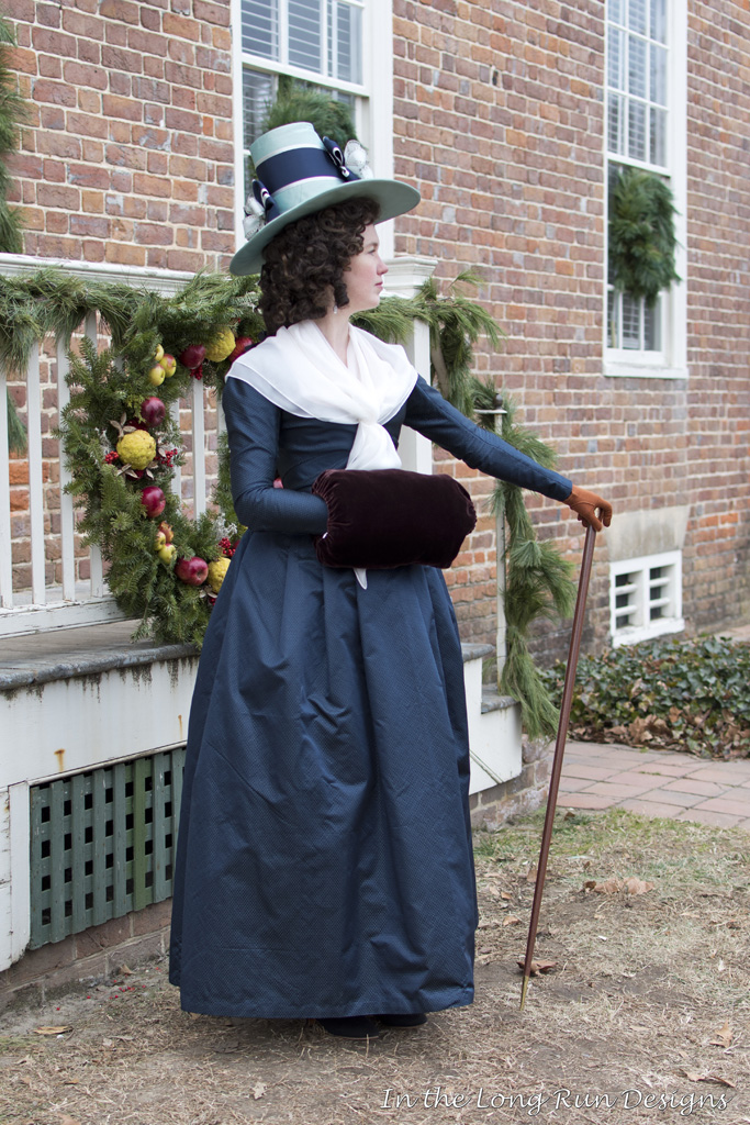 I made a new early 1790s tall hat to go with my jacket (more on that later), and a new large silk fichu. Because it was quite chilly, I wore my cream pelisse I made many years ago and carried a matching brown silk velvet muff. I also found a fantastic walking stick there in one of the historic shops, and it really completed the whole look.