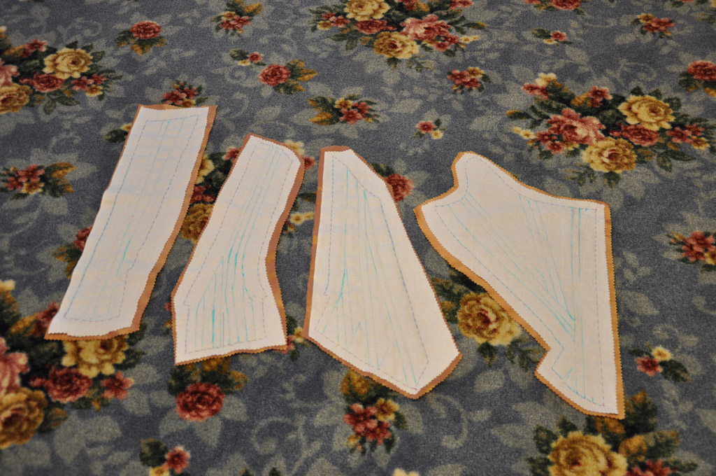 Construction was fairly straightforward. To start I traced the pattern pieces to a layer of heavy linen, and then basted that to a layer of silk taffeta, leaving lots of excess seam allowance. The visible boning channels were sewn on the machine in cream silk thread. This process was incredibly tedious since I wanted the channels to be as straight as possible and I didn’t want any unsightly backstitching on the front the corset. To finish the stitching on each channel, I pulled the thread through the front and secured it on the back of the piece. The pattern pieces were then cut out and assembled. I’m not sure I would want to repeat this process on another corset, my perfectionist tendencies are too strong, but it was interesting to make a half-boned pair of stays with visible stitching.