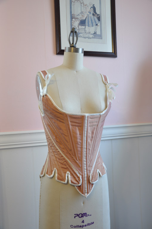 After the boning was inserted and the eyelets on the back were worked, I tried on my stays to check the fit before moving on to binding. I am incredibly glad I did! It was too big! In fact I could lace the stays completely closed. Otherwise, the shape on my body was great, so I ripped out the lining and boning, and took the stays in at the center front and at the two back seams. I left the center back alone, since certainly didn’t want to have to redo all those eyelets! To finish, I added decorative ivory silk ribbon along the seam lines and bound the stays in ivory cotton (since it was all I had on hand).