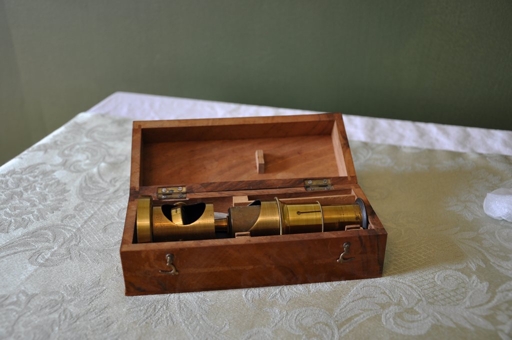 The microscope was sold as a travel or field microscope and it’s quite perfect for my purposes. The microscope is brass or brass colored metal and comes in its own polished wood carrying case. Its only about six inches long, making it a convenient prop. To work the microscope, the barrel slides up and down and there is an adjustable mirror under the lens to catch the light. It’s a little hard to get enough light to properly see the slides, but when you can all the lenses are in working order. I’m not sure of the age, but I would guess it’s from the late 1800s or early 1900s. Anyone know?