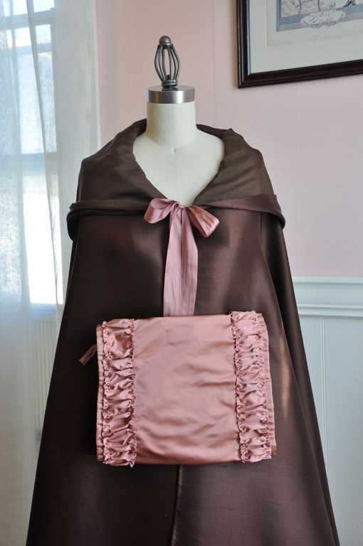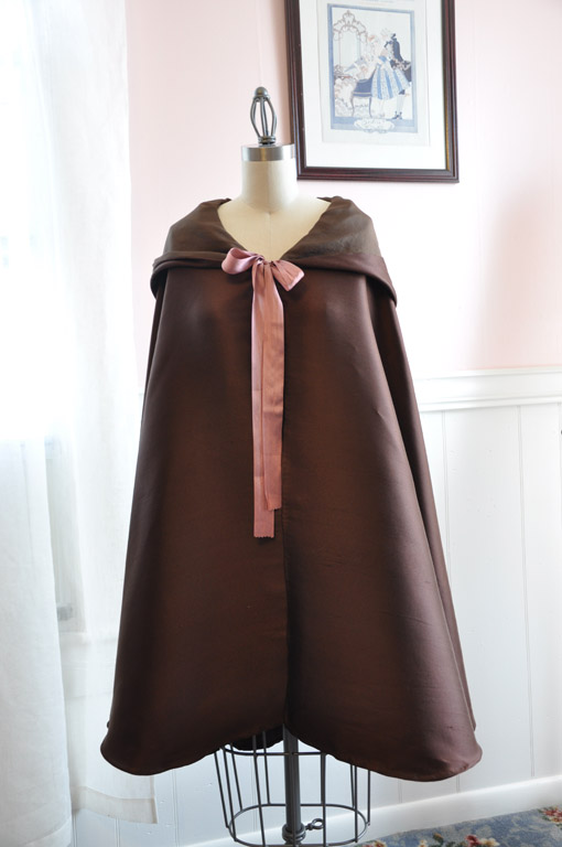 Ever practical, I decided to make a new wool cloak first, in a neutral color that would go with all my outfits. Using the pattern in Costume Close-Up as my guide I made this cloak from a lovely bronze wool/silk blend satin. The fabric is soft and smooth like silk, but still nice and warm like wool. I lined the hood in chocolate brown silk and added pink ribbon ties for fun. The cloak closes with hook and eye under the ribbon. The cloak is machine sewn with hand finishing.