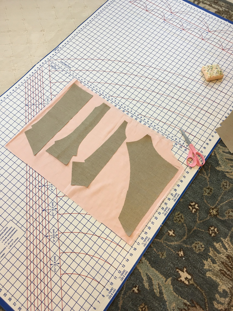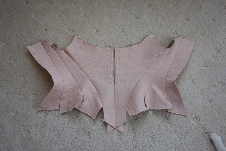 The stays are made from two layers of linen buckram for the inner structure and a layer of pale pink linen as the outer fabric, and is mostly machine sewn. The boning channels were stitched on each piece individually, and then the stays were assembled.