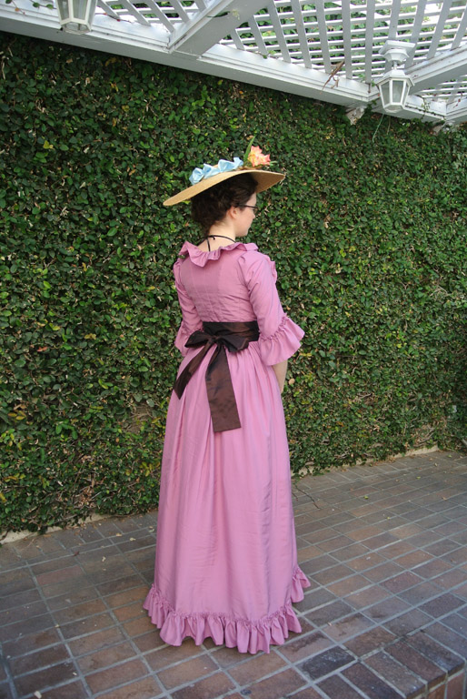 Because of time constraints, the dress is mostly machine sewn with hand finished details (hems, ruffles, etc.) The back has shaped seams like a late 1780s dress, with the back skirt attached by gathers. For the front, I cut the shoulder strap and neckline into one long panel that runs the length of the front. This panel is attached to the back at the side bodice and skirt seams, as well as the shoulders. A drawstring channel runs from the top of the shoulder to the center front on either side, and the front waist gathers are only held in place by the sash.