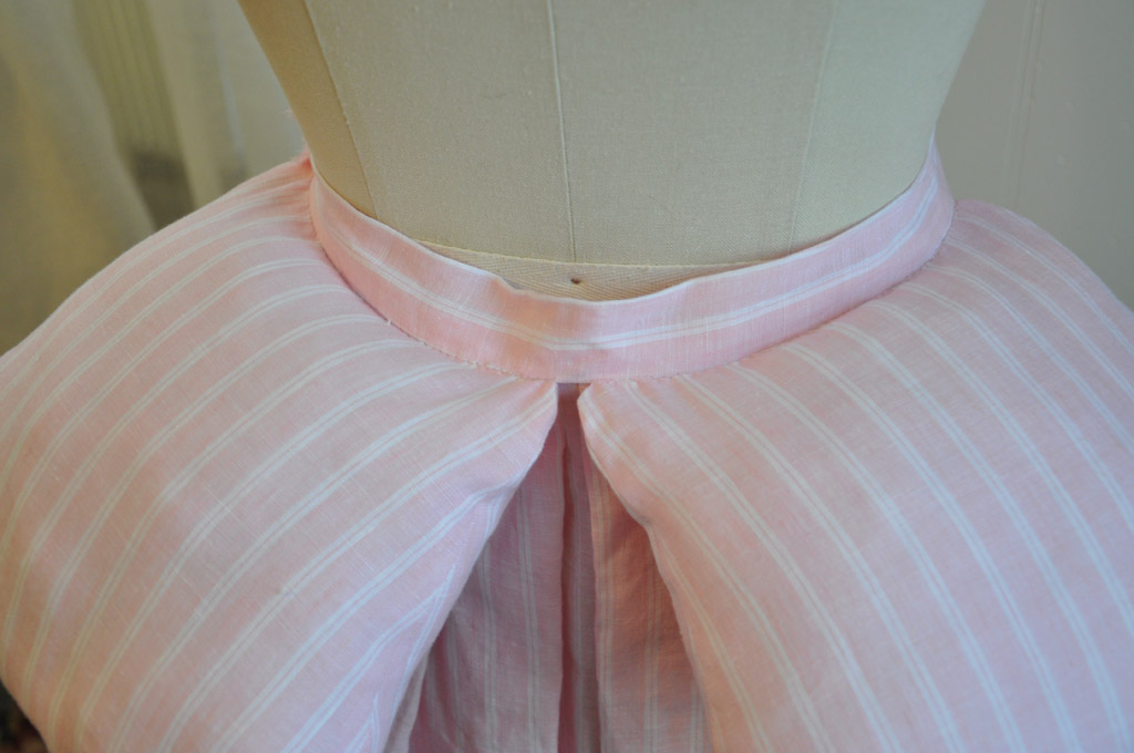 My new rump is made from pale pink striped linen (to match my petticoat and other undies, because I’m cool like that). It is two separate pillows attached to a half petticoat. Each piece was assembled separately and then the pillows were whipstitched to the petticoat waistband. I have no idea if this is how it was constructed in the period, but it seemed logical to me.