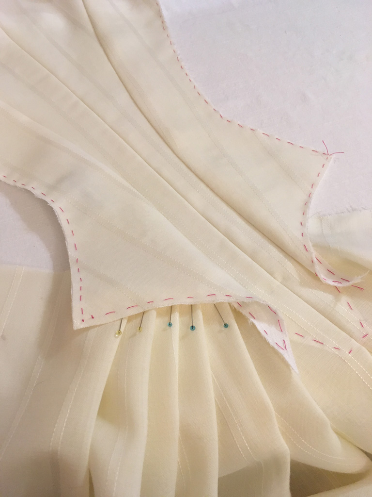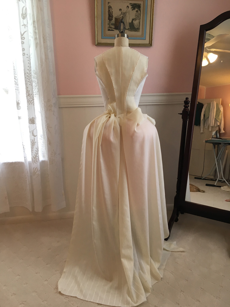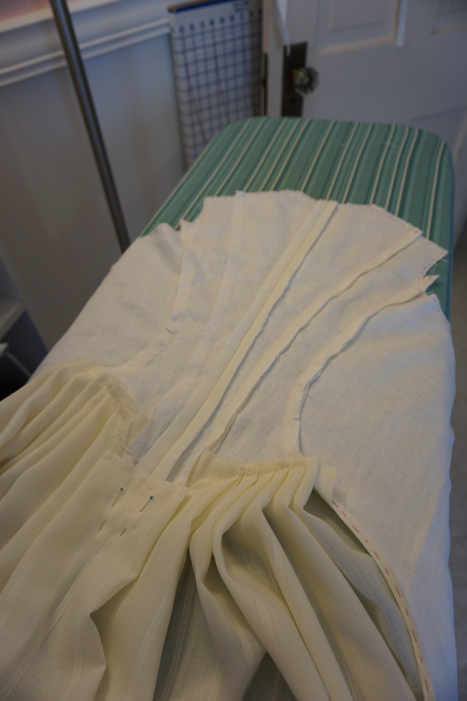 Since my fabric was sheer and delicate, I flat lined each bodice piece in a lightweight linen. The linen was hand basted to each piece of wool and then the pieces were assembled, started with the back. The center back seam was sewn all the way down to the end of the lining, and the excess formed a box pleat behind the seam, and was tacked above the waist. Then the side back, and front pieces were attached, and the skirt portion of the back pleated in place. I added another panel to each side of the skirt, pleated it, and then leveled the skirt over the false rump.