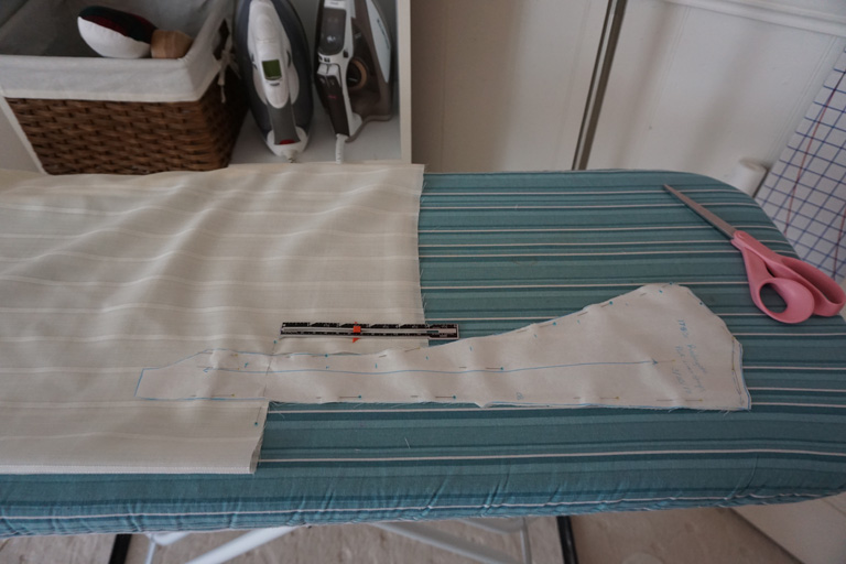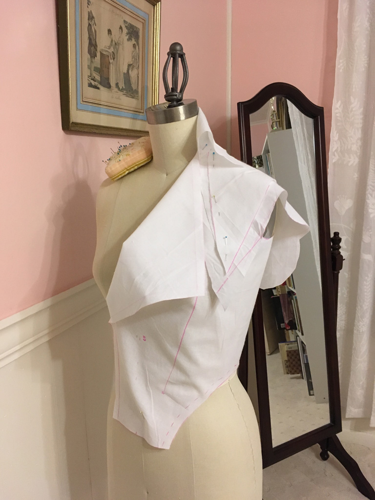 One of the hallmarks of a redingote seems to be the fact that the back bodice pieces are cut in one with the skirt. The LACMA pattern shows both the center back and side back pieces cut in one; however, I found a couple of extant examples that appear to have just the center back pieces connected to the skirt. To cut the back, I measured the approximate length of the panel on my form, folded it in half, and then laid the center back pattern piece about 2.5 inches from the fold. I cut out around the pattern piece, stopping 1.5 inches from the waist, and leaving 2.5 inches of excess about this on the side back seam side for pleating the skirt later.