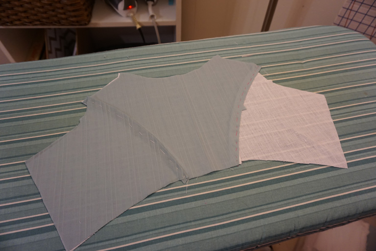 The front bib is a long strip of fabric with a slightly curved top edge and a straight bottom. The front skirt is attached to the front panel with a seam under the bust, It has a drawstring at the bust and in the waist seam, and opens at the center front to just past the waist. Once this piece was assembled, the sides were hemmed and topstitched to the bodice side, just past the bust.