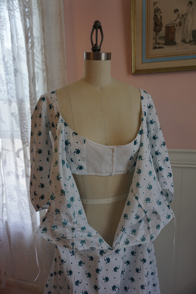 detailed in this post from last year, with a few small changes. The pleats at the back are slightly different, and I ran out of fabric so I had to piece the top of the back skirt gore. Also, I wanted to mix things up a tiny bit, so I added a little self-fabric belt. It attaches at the back with two fabric covered buttons and wraps around to be pinned in front.