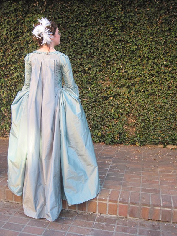 A 1770s robe a la francaise, hand sewn from aqua silk taffeta.