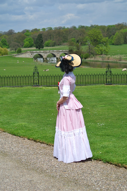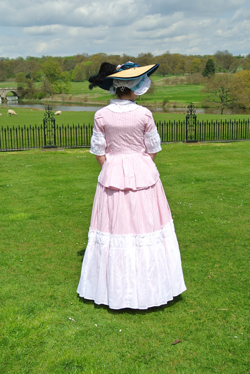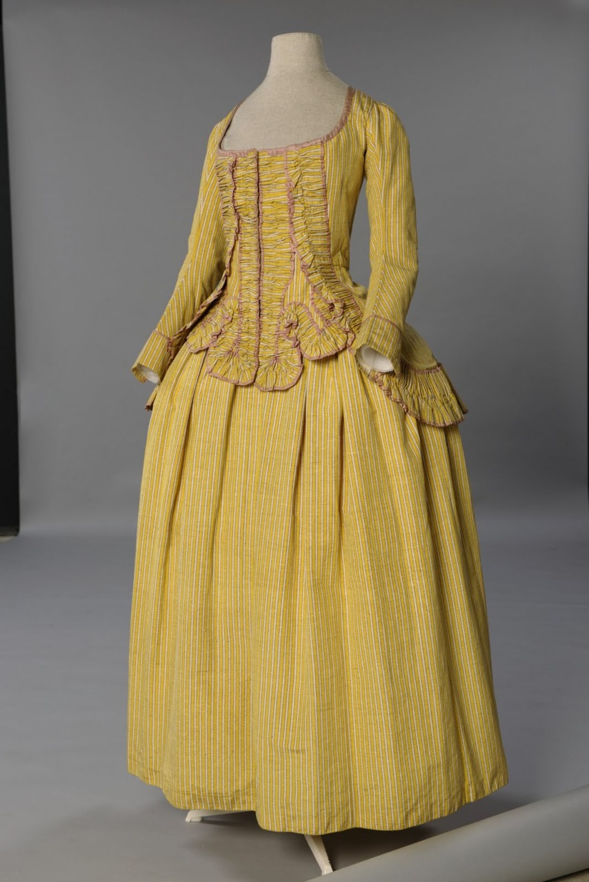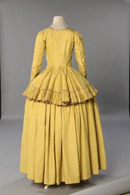 A late 1770s-early 1780s polonaise jacket and petticoat made from pink and red striped cotton and trimmed in white cotton voile.