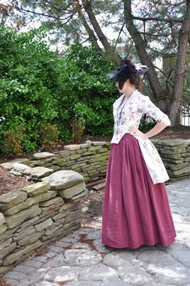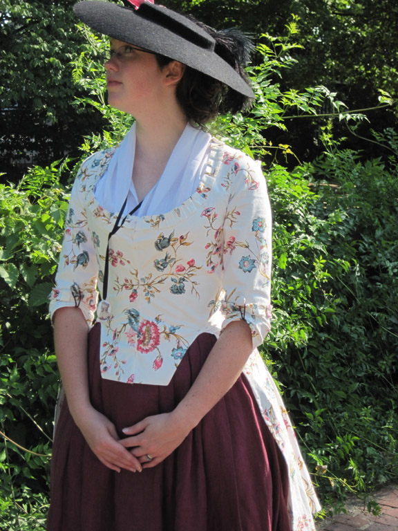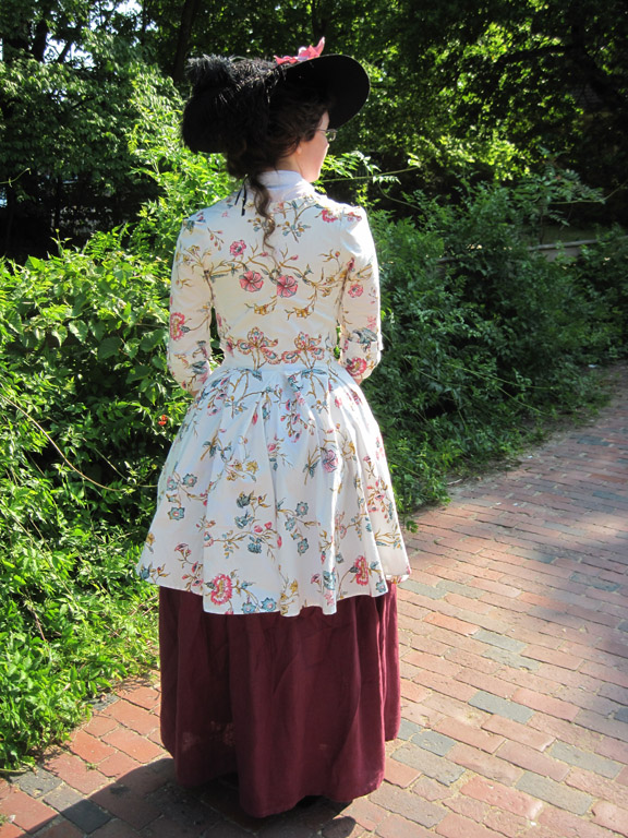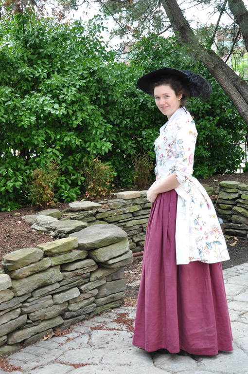 A circa 1780 printed cotton caraco jacket, worn with a berry colored linen petticoat.