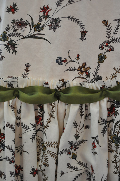 The petticoat is simply two pannels of cotton, knife pleated to a waistband. The petticoat hem has a wide, full ruffle, pinked on both sides, to which I added some puffed green silk ribbon.