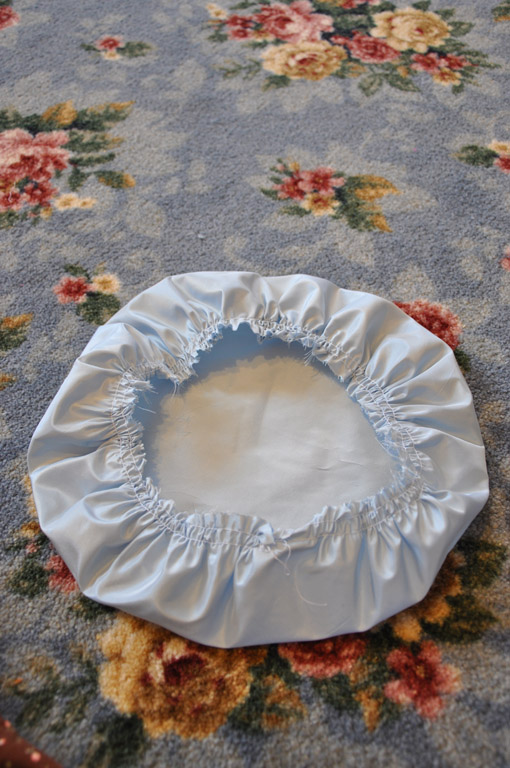 For the taffeta layer I cut out a circle using the hat as a template. I would have liked to have made it bigger, but I was working with a limited amount of fabric (less than half a yard) and I really wanted to use the blue silk. I gathered the edge of the taffeta and pinned it over the organza, pulling it out further over the brim of the hat.
