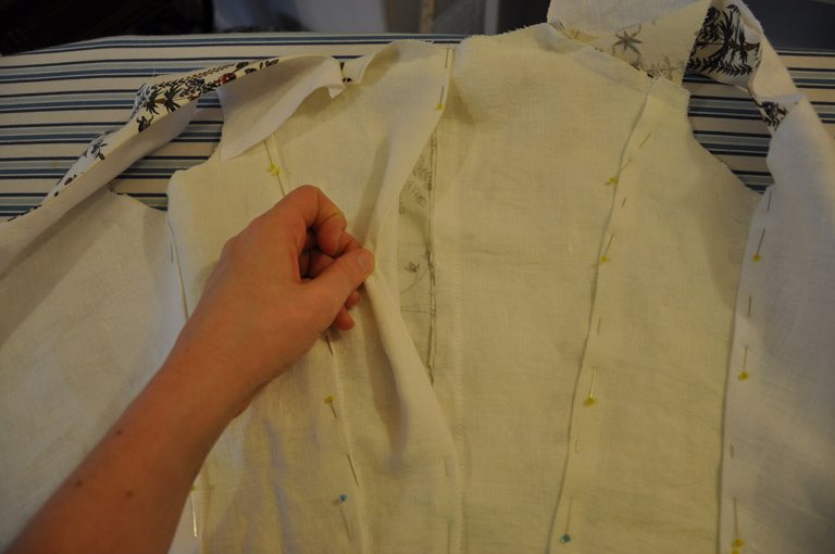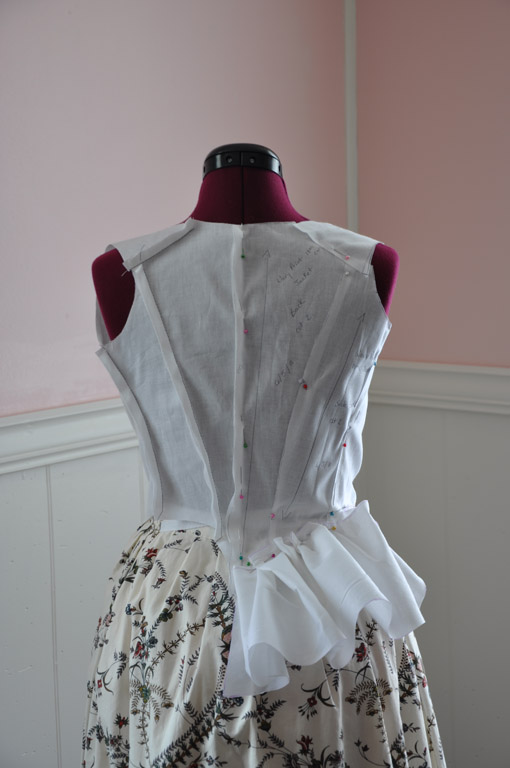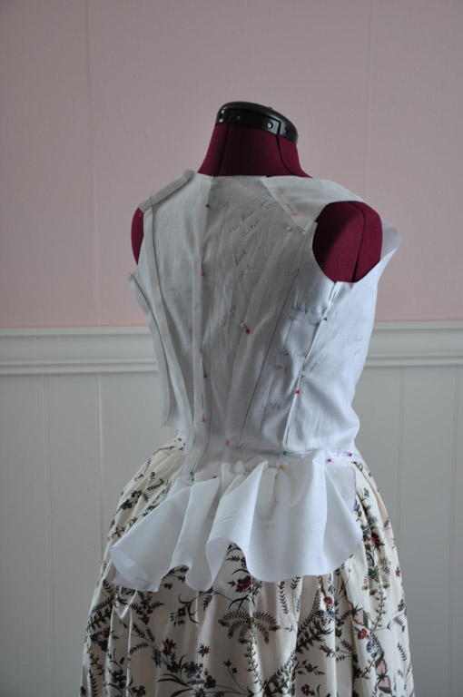 The jacket peplum is a semi-circular piece of material, gathered to the back point. I simply played with the fabric on the form until I liked the shape.