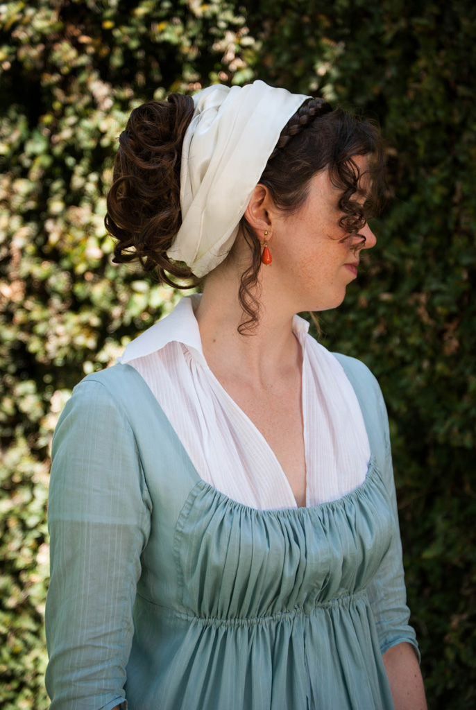 The pattern is based on my existing drawstring dress patterns and my 1790s base patterns, but I used the “Taffeta Round Gown, 1795-1800” pattern on page 172 of An Agreeable Tyrant as a a major reference.