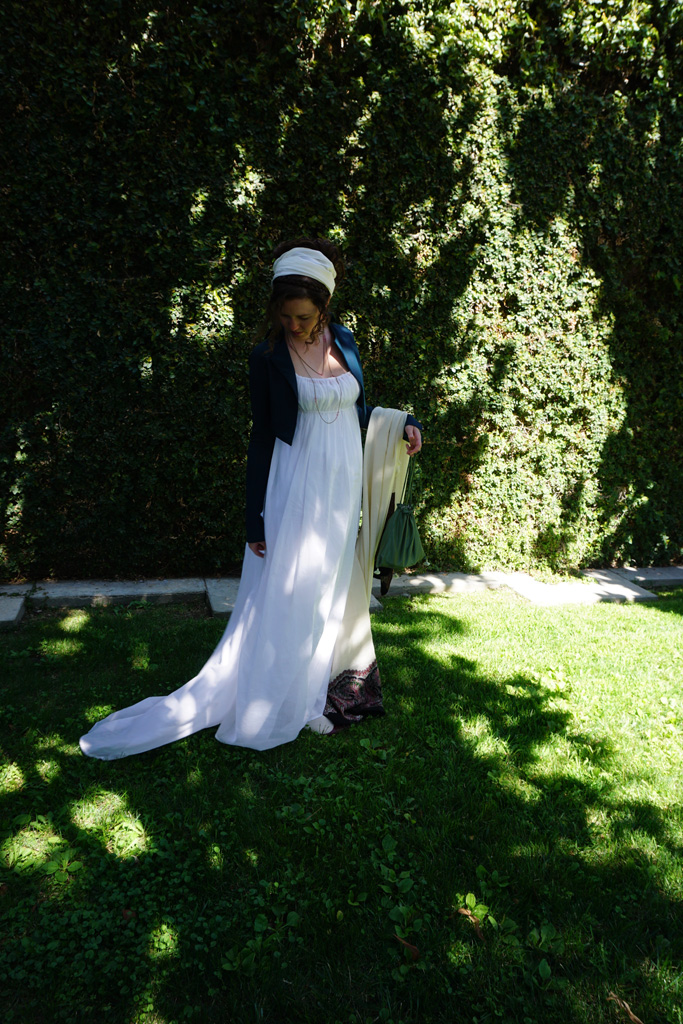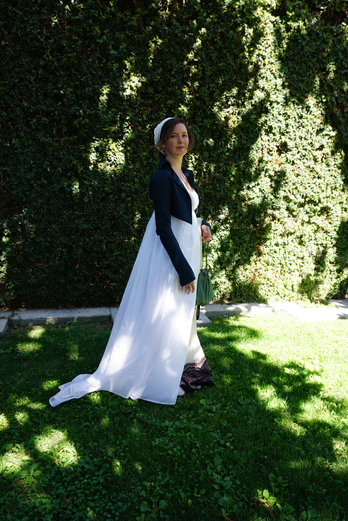 When I was planning what to make for my trip to Bath, an all-weather spencer topped the list. The only spencer I had was my blue spotted silk, which as lovely as it is, isn’t good to wear in the heat or in the rain. Yes, I realize my trip was in June, but I run cold and England’s idea of summer is not mine. I froze on both my previous trips and was determined not to do so again!
