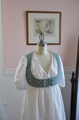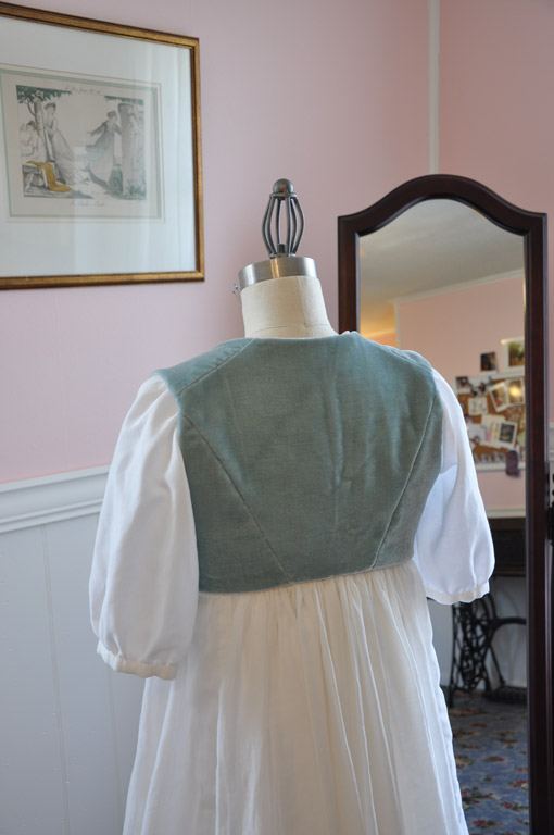 Before I had even finished my new 1790s dress, I knew I had to make a little sleeveless spencer or over bodice to go with it. I've been wanting one (or several) for ages and this dress seemed like the perfect thing to wear under it. I had some blue silk velvet in the stash and using the pattern from my dress, I had a new accessory in a little over a day!