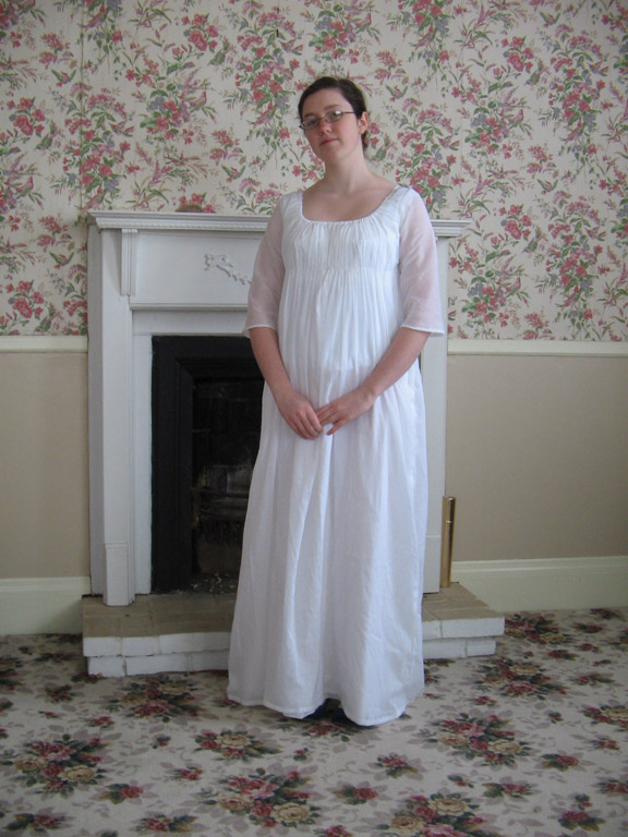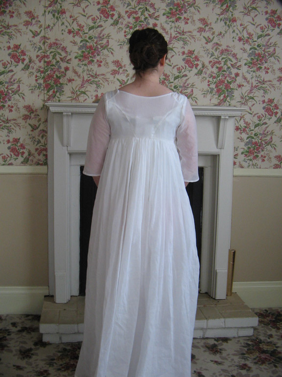 A late 1790s gathered front dress, made from white cotton voile. The dress is unlined and is worn over a bodiced petticoat. The back of the dress is fitted, using a basic regency bodice scaled up from Hunnisett, while the front of the dress is one full width of fabric gathered at the neckline and under the bust. The front is open to the waist and ties closed at the center front. The dress was sewn on the machine and finished by hand.