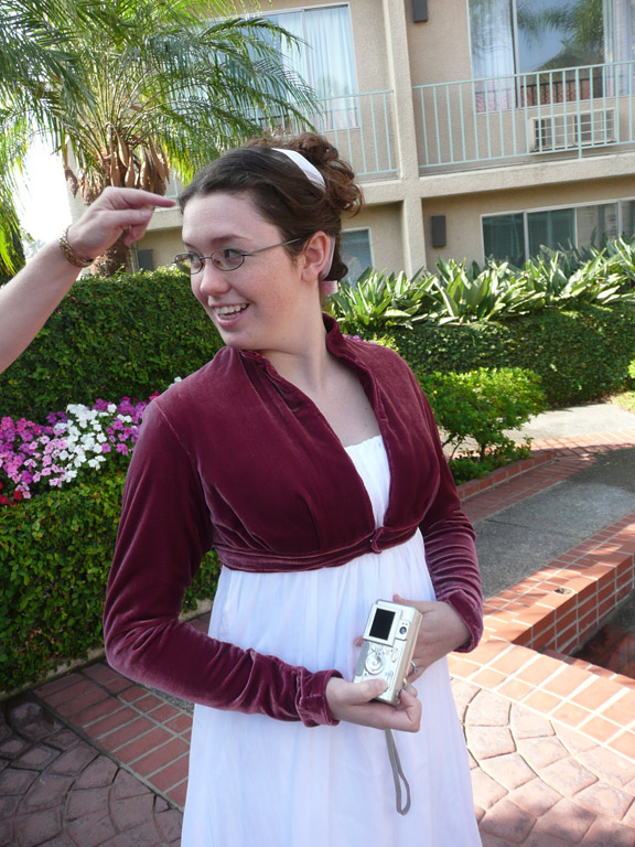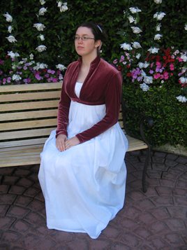 The spencer, slightly later in date, is made from plum colored silk velvet, interlined in cotton, and lined in caramel china silk. The spencer was sewn entirely by hand and the edges were finished with self-piping. It has a standing collar and is ment to be worn open in front, closing with a belt under the bust. It has integrated tails in back and two covered buttons for decoration. The belt and button detail was inspired by a spencer in